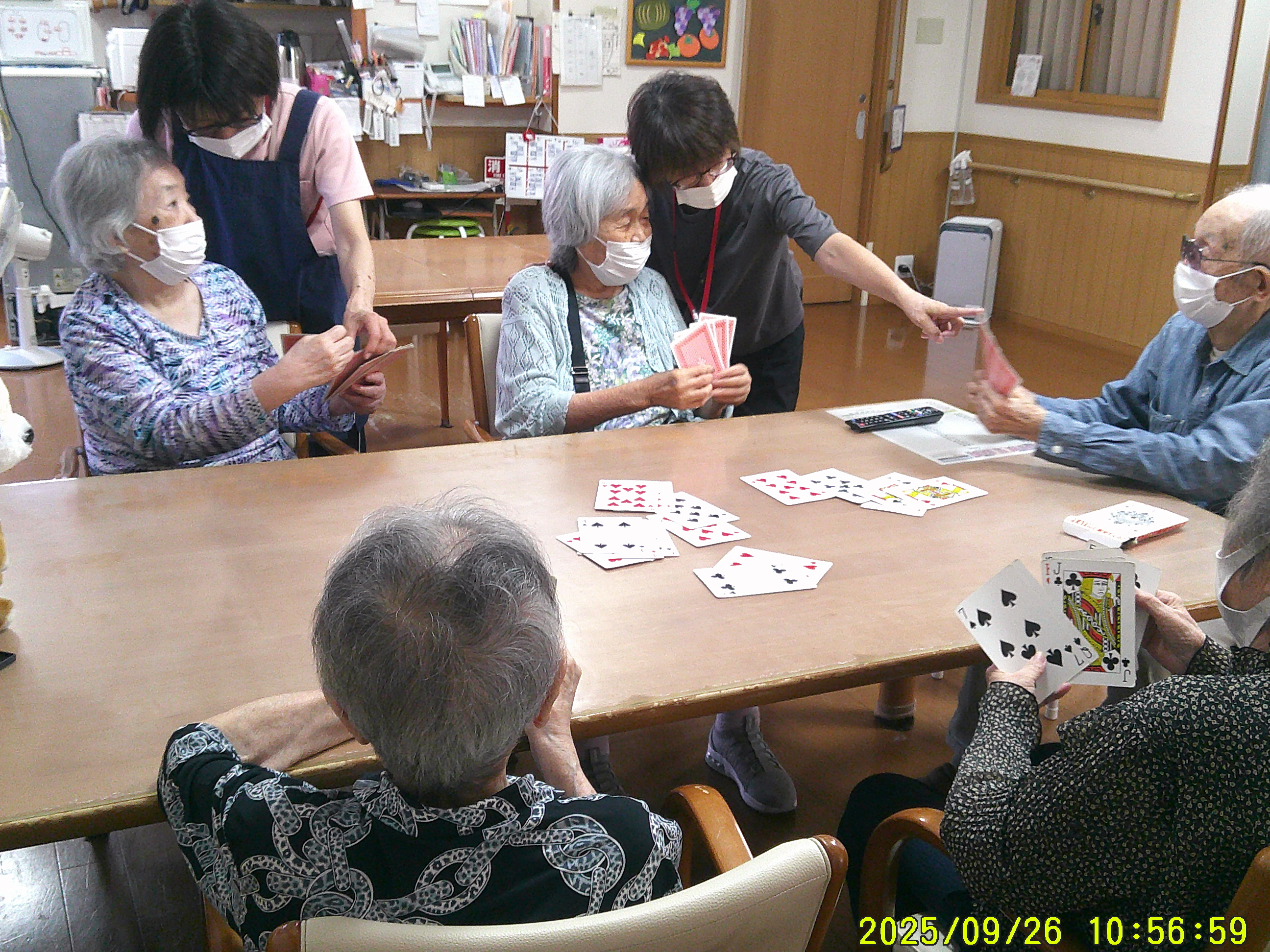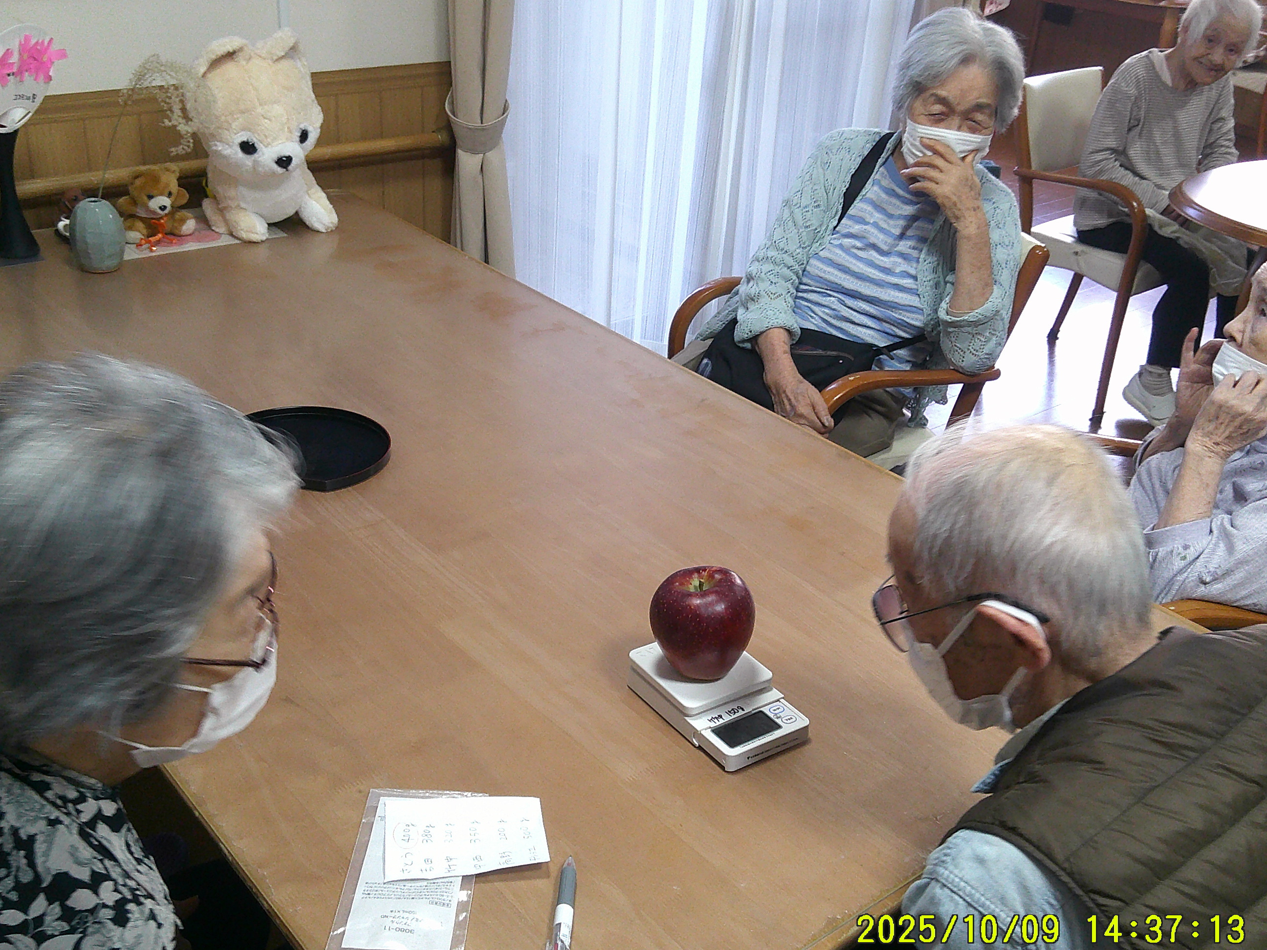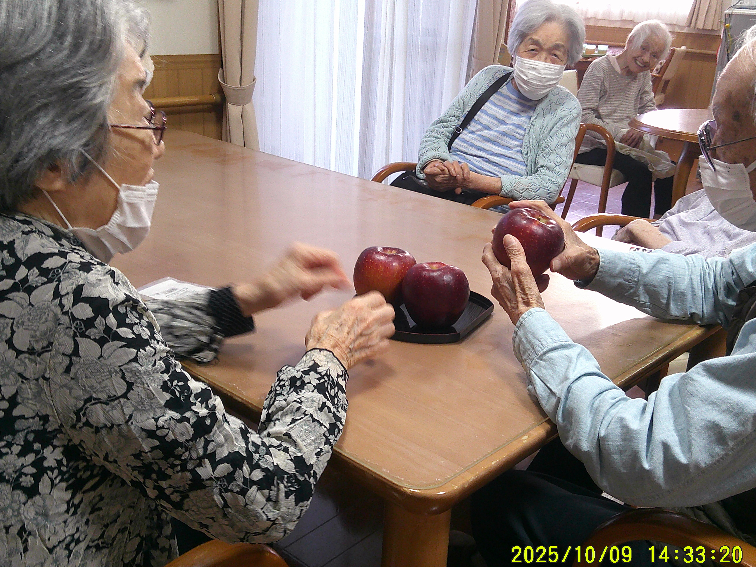 ババ抜き大会 2025-10-09 (木) 1位の方にはいいことがあるよ!皆さん負けないぞ!とやる気マンマンでした。 お誕生会開催 2025-10-11 (土) 9月10月が一番お誕生日を迎える方が多い月。中間島で一番のお姉さんも誕生日です。なんと103歳!みんなでケーキを作り、お祝いしました。 介護実習生さんと工作(柿作り) 2025-10-08 (水) 本物の柿みたいだね!! 今日は十五夜です♪ 2025-10-06 (月) みんなで、お月見団子を作って食べました!綺麗なお月様が見られますように…☆ 秋 2025-09-30 (火) 夏も終わり肌寒くなってきました。施設内の掲示板も秋使用になってます。 何グラムかな?? 2025-09-26 (金) リンゴの重さあてゲームをしました。「なかなか難しいねぇ〜」と皆さん悩んで答えておられましたよ お彼岸 2025-09-24 (水) あんこときな粉のおはぎを作っておやつに食べました。「ほっぺおちそうだわ」 栗見つけた 2025-09-24 (水) 小さい秋を感じました。 私の重さは何グラム?? 2025-09-23 (火) 大きなかぼちゃの重さ当て大会です!さて、何グラムあるでしょう(*^^*) 音楽療法 2025-09-22 (月) 久しぶりに参加しました。懐かしい歌と太鼓も力強く!!