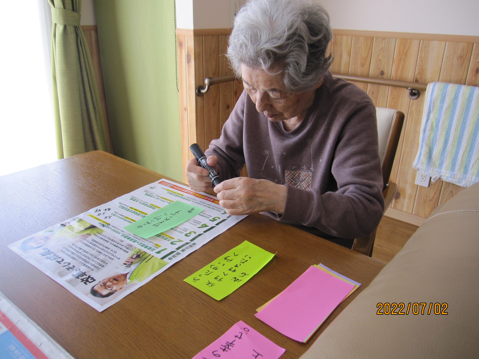 はらぺこさん弁当食べました! 2023-06-11 (日) ボリューム満点のお弁当を皆さん喜んで食べておられました。 県職員研修福祉体験 2023-06-09 (金) 利用者の方と新聞紙をたたみながら話したりして、短い間ですが体験していただきました。 あやとり 2023-06-05 (月) 昔、よ〜くやったね 畑のお世話始まりました! 2023-06-03 (土) お手伝い好きの入居者さんが水やりなど手伝って下さり助かってます。 洗濯物たたみ 2023-06-01 (木) 職員と一緒に手を動かしました。 あじさい作り 2023-05-30 (火) 色合いがキレイだねぇ〜 コスモスプランター菜園 2023-05-27 (土) 肥えた土作りから保水への共同作業。 職員とオセロ対決 2023-05-24 (水) どこに置いたらたくさんひっくり返せるかね〜 チューチュー棒 2023-05-04 (木) この日は気温が高くなったので氷アイスでクールダウン 風船ゲーム 2023-04-29 (土) 風船をうちわであおいでパタパタパタパタ・・・