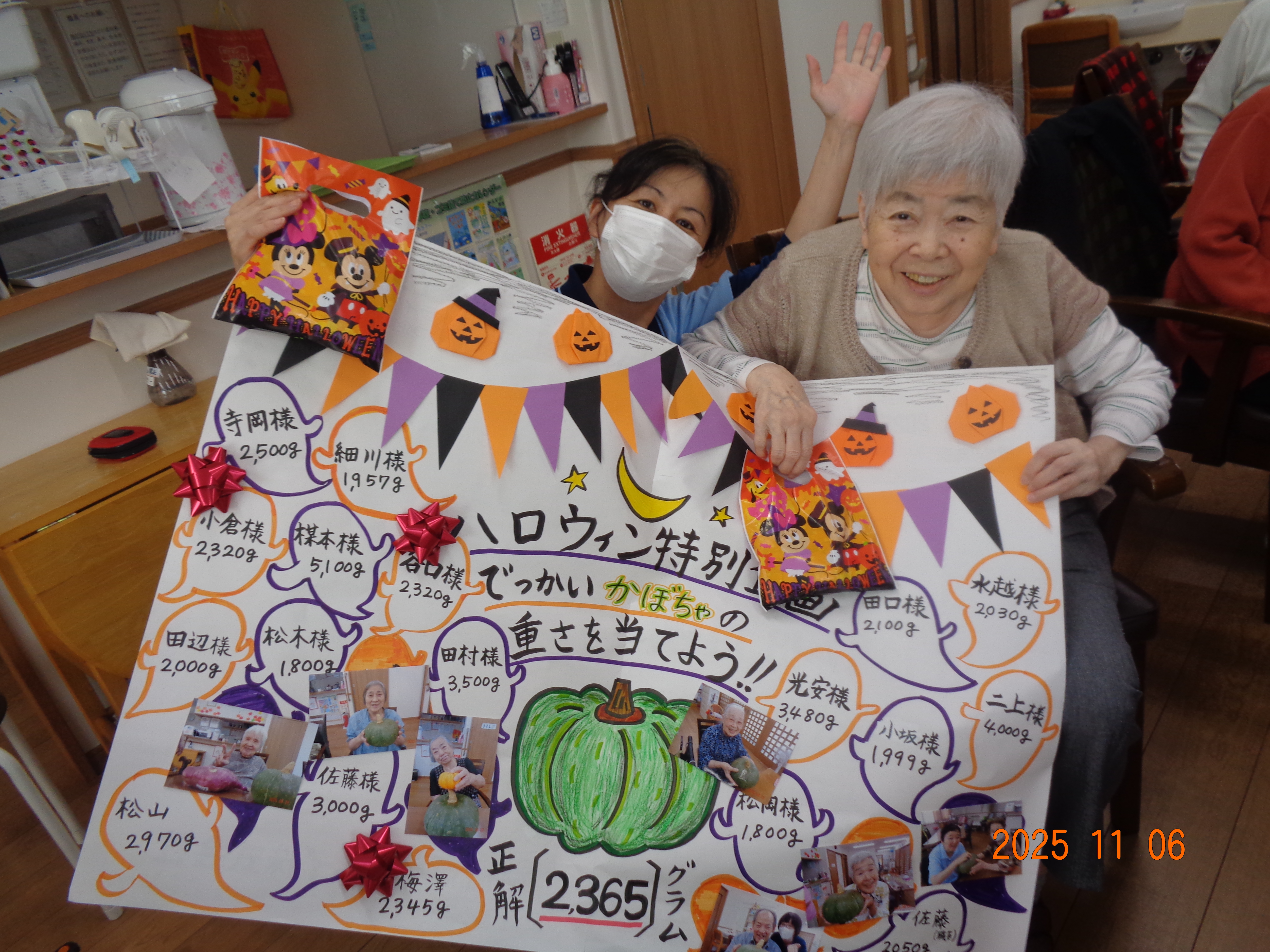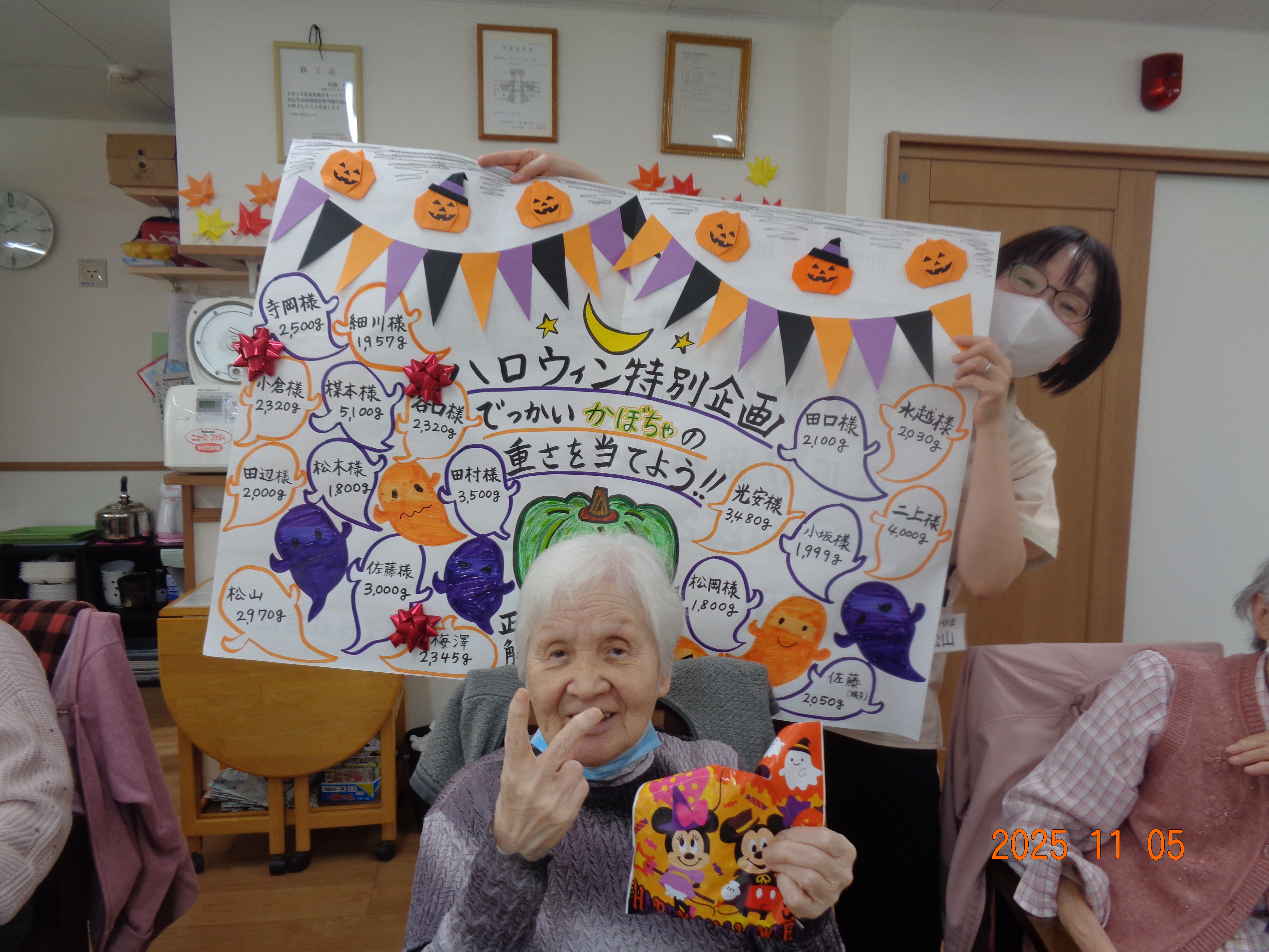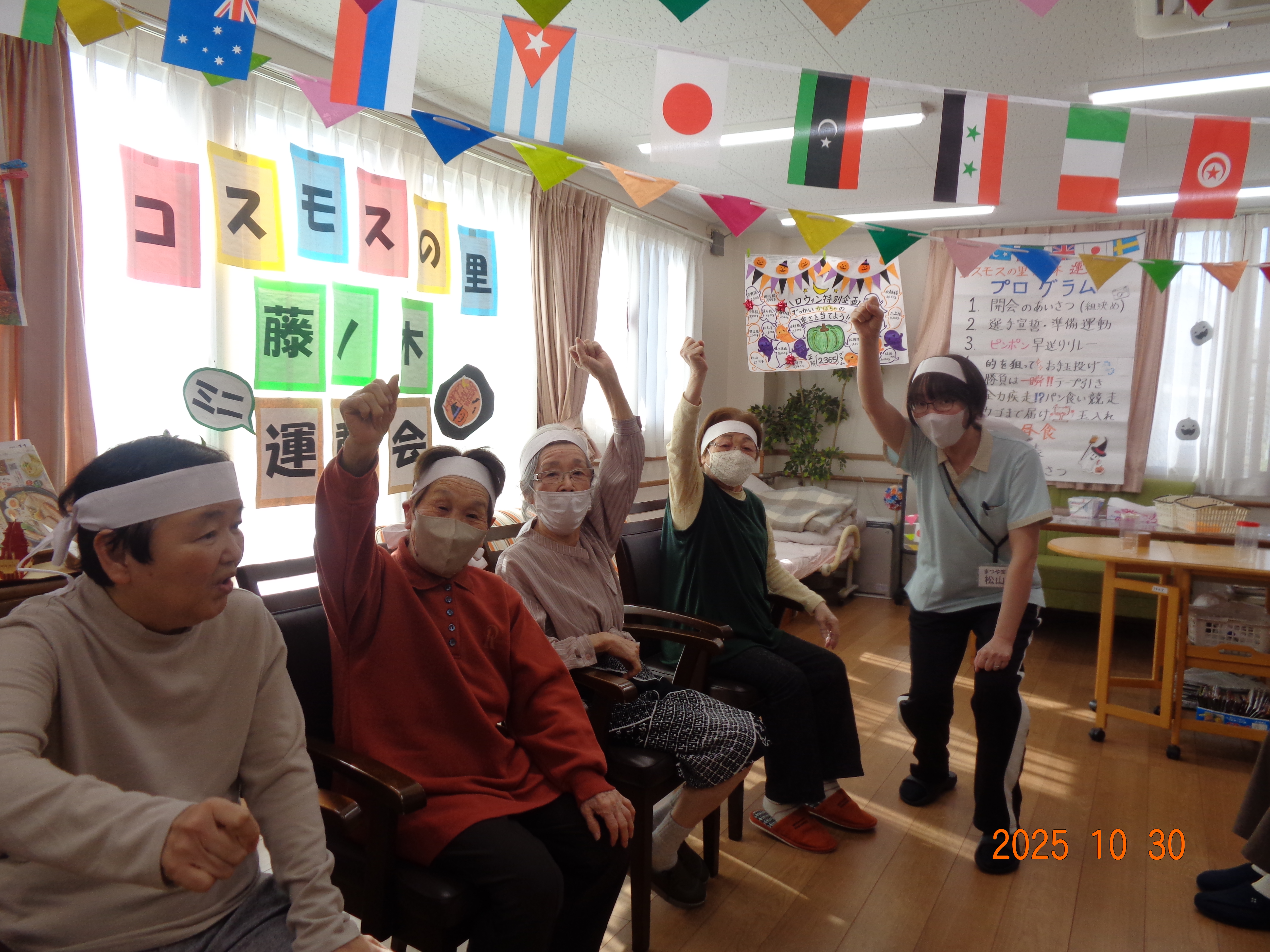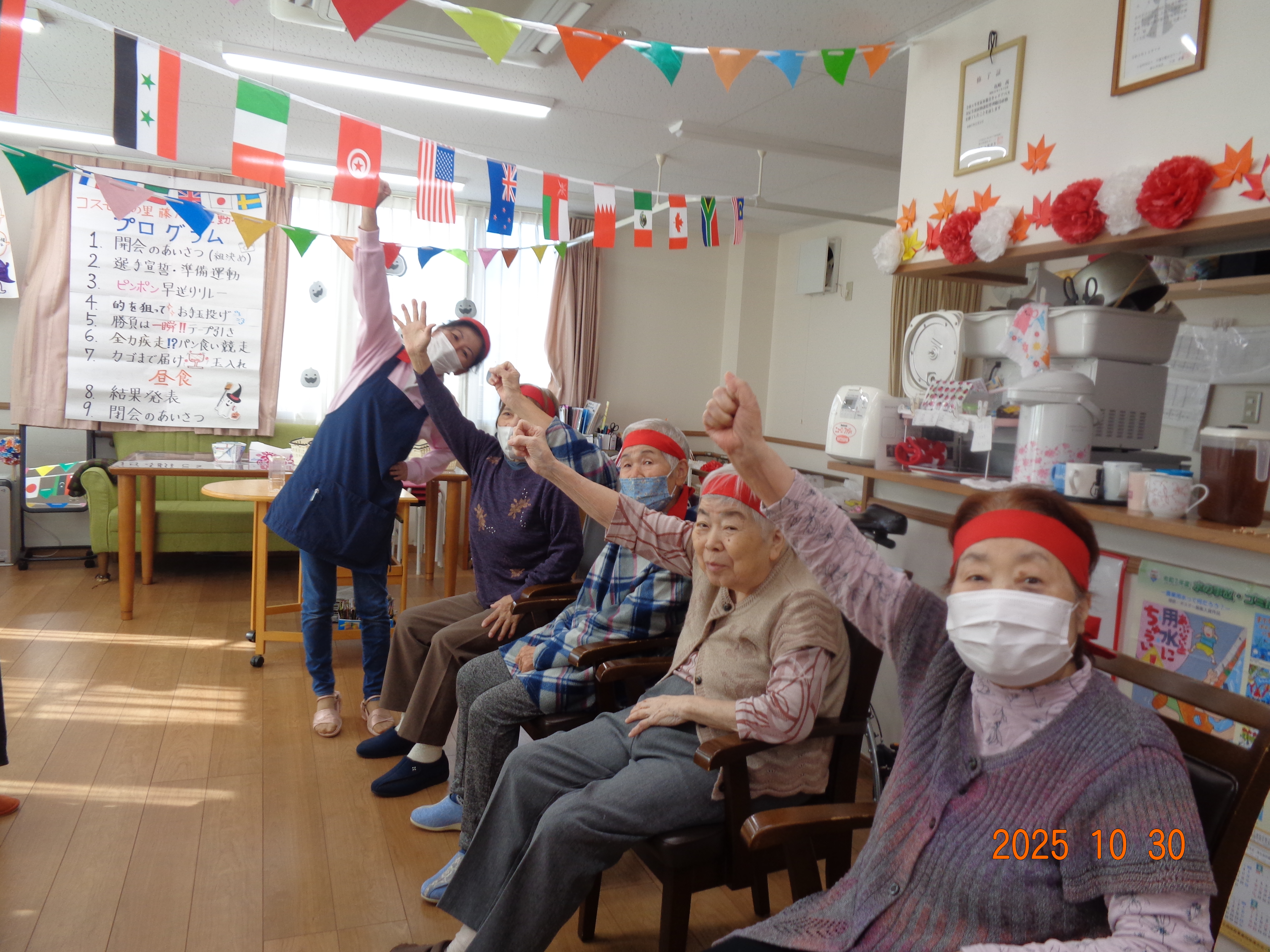 ツリーを準備 2025-11-77 () ハロウィンが終わりクリスマスの飾りつけしています。 実務者研修実習生 2025-11-07 (金) 介護の勉強の一環としてコスモスに来られました。いろいろなことを学ばれ、一緒にお仕事が出来たらと思っています。 ハロウィン企画、結果発表〜♪ 2025-11-05 (水) 重さ当てをしていた巨大かぼちゃ…なんと、2365gでした!!ニアピン賞の方、おめでとうございます(*^^*) 花作り 2025-11-05 (水) 利用者様一人ひとり壁飾りに菊の花を折り紙で作りました。華やかになりました。 マッサージにうっとり 2025-11-01 (土) 皆さんに癒しをと、ご利用者様直々にマッサージ!プロのような触り心地にうっとりです。 ☆★ 運動会開催☆★ 2025-10-30 (木) 今年も、楽しく!ケガせず!みんなで体を動かして、たくさん笑いました(≧▽≦) 花植え 2025-10-29 (水) 来春に向けてチューリップ、ビオラ、パンジーを植えました。春が楽しみです♪ お弁当の日 2025-10-26 (日) 今月は寿司くいねぇのお弁当です。大勢で食べると楽しいですね。 ブーツを探せ 2025-10-21 (火) なかなか、同じ柄が見つかりません さつまいもの茶巾しぼり 2025-10-20 (月) 実習生さんと一緒に手作りおやつを作りました。キレイな形に出来上がりました。