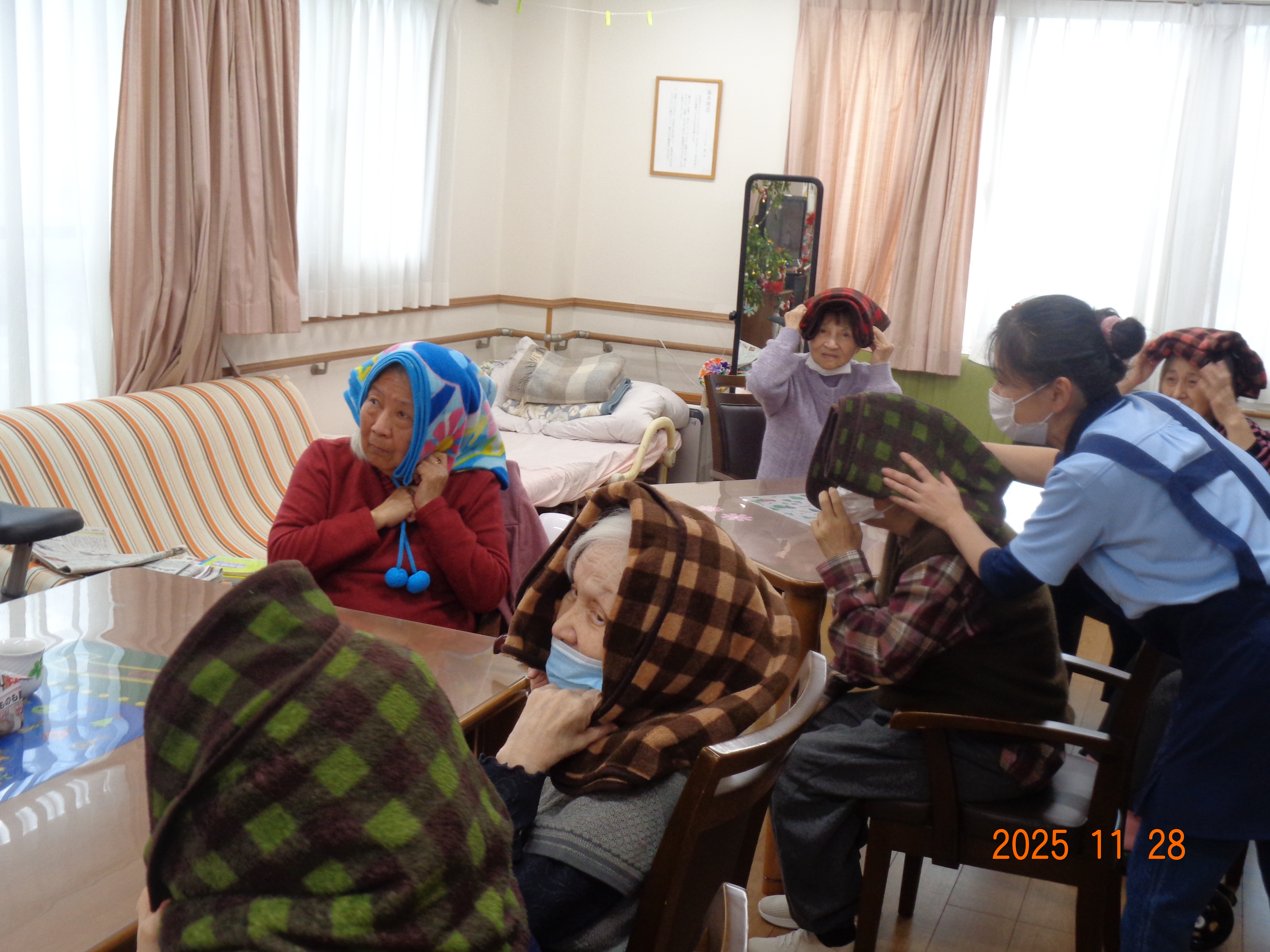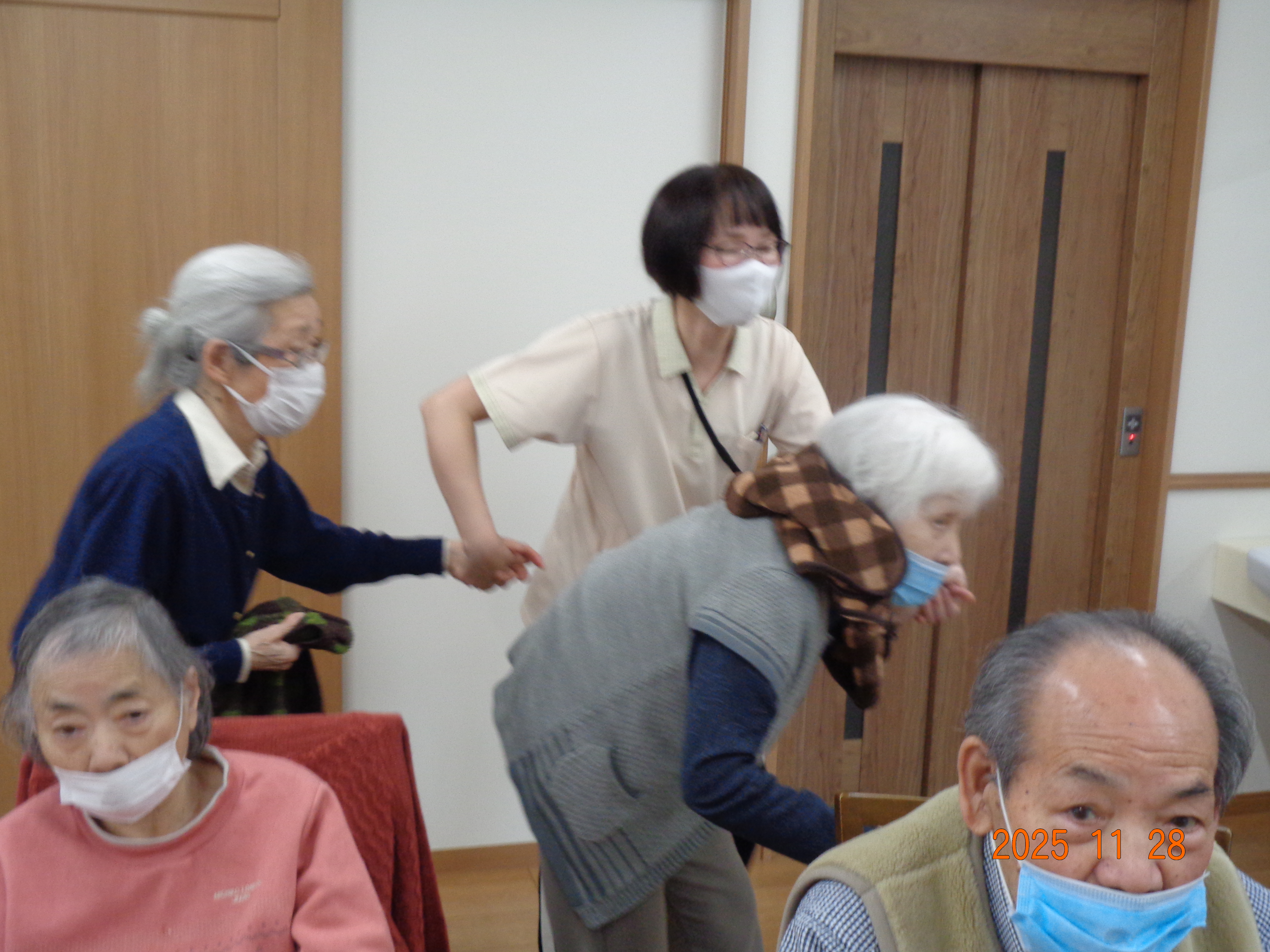 クリスマスの準備 2025-12-11 (木) クリスマスにむけてツリーに飾りつけをしました。 体調はいかがですか? 2025-12-10 (水) 月に2回来ていただいている訪問診療。先生の顔を見るとホッとします。 初雪の季節ですね 2025-12-09 (火) 「雪降ったね」「今年はどれくらい降るかね」と話をしながら作りました。 かぶれるツリー 2025-12-05 (金) Xmas会にむけてツリー型の三角帽子を作りました。 トランプ 2025-12-04 (木) 皆で脳トレのために神経衰弱をしました! 避難訓練です!! 2025-11-28 (金) 地震から火災がおきた想定で、避難訓練を行いました。皆さん真剣に取り組まれました! クリスマスにむけて 2025-11-25 (火) 少しずつ飾りを作っています 花の植え替えの手伝い 2025-11-25 (火) 晴れた日に葉牡丹・ビオラ・パンジープランターに植え替えました。春には根がついて増えとるね!! お弁当の日 2025-11-23 (日) 今月はたこ焼きのお弁当です。大勢で食べると楽しいですね。 もうすぐクリスマス 2025-11-14 (金) 皆さんでクリスマスツリーを飾りました